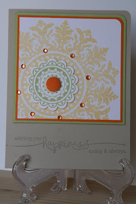 Well, I created this card for my dear friend Arielle's colorQ challenge. She challenged us to use going gray (I substituted sahara sand), barely banana, certainly celery, pumpkin pie and white. And that is what I came up with.